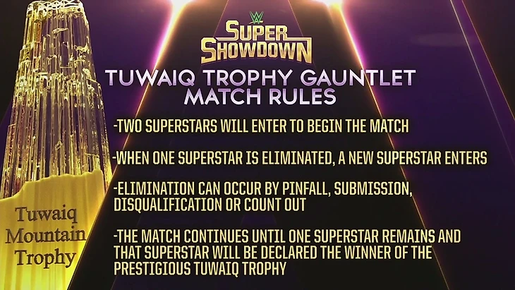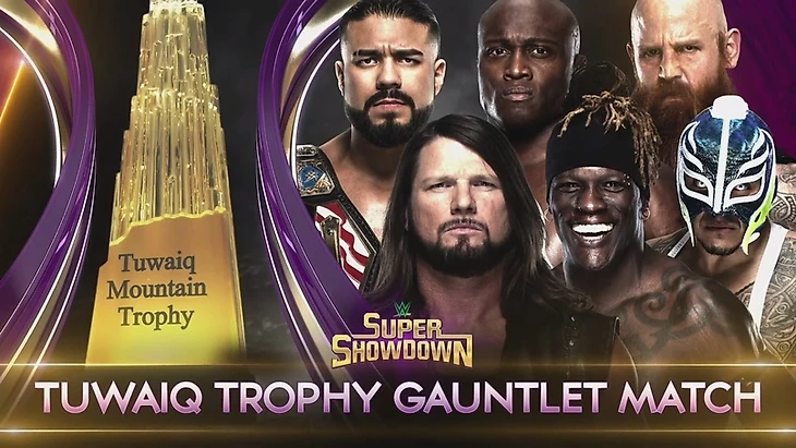 2) Ар-Труф против Андраде против ЭйДжей Стайлза против Рея Мистерио против Эрика Роуэна против Бобби Лэшли - гаунтлет-поединок за кубок Tuwaig Mountain Trophy