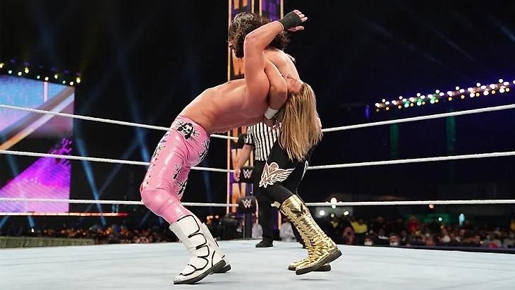 Далее прошёл snap-суплекс от чемпионки - удержание снова вышло мимо и той пришлой по-новой брать Наоми измором с помощью болевых. В этом деле Бэйли держала всё в своих руках, как бы мисс GLOW не старалась отвечать. Но её старания начали окупаться в итоге - Наоми удалось отбиться от чемпионки серией ещё некоторых коронных хайфлай-манёвров и завершить это springboard-энзигири и через мгновение добавить springboard-кроссбади, но удержание тут снова вышло до 2. Дошло до применения Наоми своего болевого Feel the Glow, только вот Бэйли быстро среагировала и тут же добралась до канатов. Наоми не сдавалась и готовила серию Flashing Lights - это не вышло, а сгруппироваться на новый мув особо не получилось из-за Bayley-to-Belly суплекса - удержание, тем не менее, не сработало. Началась серьёзная стычка с небольшими реверсами и Бэйли усилила агрессивность своих атак, окончив это дело back-drop суплексом. Второго захода не получилось, но как только Наоми отошла в угол ринга - Бэйли быстро пробила свой high knee, правда реализовать продолжение не удалось. А Наоми сразу же вышла на Split-Legged Moonsault - и тут чемпионке удалось с помощью небольшой хитрости лишить Наоми возможности быстро встать на ноги. И пока последняя пыталась понять что случилось - Бэйли не промедлила и вмазала своей оппонентке Rose Plant и спокойно удержала Наоми до 3.