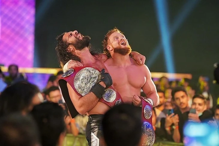 Началась стычка между Монтезом и Бадди - последнему, как и Сету следом прилетели по энзигири и Форд провёл свой красивейший frog-сплэш, но нет, удержание и тут вышло мимо. И причём сорвал его именно Бадди, которому Доукинс оформил полёт через стол - Сет остался 1 против двоих и кзаалось, что на этом всё. Только вот "Архитектор" оказался более ловким, плюс и Бадди быстро пришёл в чувство - стычка чуть не окончилась двойным педигри от чемпионов, но претенденты перевели это в двойной DDT. Снова началась стычка между командами - уже на рингсайде и там претенденты взял победу. Только вот на ринге Доукинс получил high knee-страйк от Бадди и именно в голову - рефери снова стал удерживать Мёрфи, а Сет оформил Blackout на Анджело. Дежавю случилось и Мёрфи в очередной раз уверенно удержал, на этот раз Доукинса, после финишера Роллинса и именно до 3.