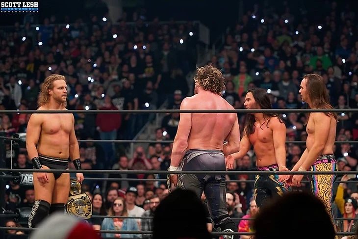 Джексонов встретили достаточно неоднозначно, и, забегая вперед, скажу, что негативная реакция по ходу матча только усиливалась, а Ник и Мэтт это дело только подогревали. Чемпионов же очень поддерживали. Начали матч Кенни и Ник, все прошло по классике, с чейн-рестлингом, реверсами и вот этим всем, и в итоге атлеты пожали друг другу руки. Тэг Мэтту и Адаму, та же история с классическим back and forth, и Джексон предложил рукопожатие, на которое Пэйдж ответил плевком в лицо. Это Мэтта разозлило, и он набросился на оппонента, так что Кенни пришлось разнимать легальных участников матча в попытке установить мир, и эту тему поддержал Ник, забрав право ведения боя у брата. «Хэнгмэн» отвесил ему пощечину, за что получил серию киков, а право ведения боя перешло к Мэтту, и у Young Bucks прошла командная работа. Омегу сбросили с апрона, и Адаму досталось еще больше атак. Адам отбился, причем в этом ему помогло то, что у Мэтта имеются проблемы со спиной. Именно на ней чемпион сконцентрировал свои атаки. Тэг Кенни, и канадец добавил бэкбрейкер до 2. Право ведения боя затем вернулось к Пэйджу, который отправил обоих противников за пределы четырехугольника, пошвырял их в ограждения и собрался провести Мэтту пауэрбомбу на стол, но Кенни пожалел спину Джексона и остановил товарища. В ринге доминирование чемпионов продолжилось, пока Джексон, рискуя спиной, не провел коронные northern lights суплексы и не отправил в бой брата. Ник принялся рвать и метать, провел соперникам комбинацию из слингшот фэйсбастера и мунсолта, применив Шарпшутер на Пэйдже в ринге. Омега спас партнера, получил тэг и собрался уже провести Rise of the Terminator, однако, это дело прервал Мэтт, за что получил харриканрану. Еще один разбег в исполнении Кенни, и Джексон встретил это дело жестким киком у канатов, подарив Нику возможность удержания, но лишь до 2. «Баксы» продолжили работать над Омегой, а Мэтт вернул должок Адаму, плюнув тому в лицо. Этот факт во-первых, разозлил «Хэнгмэна», а во-вторых, позволил Омеге отдохнуть и попытаться передать тэг, однако Ник в последний момент стащил Пэйджа с апрона. Его брат тем временем провел Кенни пайлдрайвер, но и этого не хватило для победы. Еще немного доминации от претендентов, и Омега отбился бомбой, отдав право ведения боя Пэйджу. Тот в считанные мгновения уничтожил обоих соперников, закрепив успех мунсолтом за пределы ринга с третьего каната и добив Ника лэриэтом в ринге. Затем он дал возможность Мэтту получить право ведения боя, что тот и сделал, и они устроили брутальный обмен ударами, который закончился бутом от «Хэнгмэна», и Омега получил право ведения боя, проведя с товарищем командную работу и шарахнув бомбу до 2. Тэг вернулся Пэйджу, и Мэтт смог отбиться от него, после чего уже «Баксы» зашли на командную работу, а право ведения боя досталось Нику. Он с помощью отличных ударов ногами справился и с Пэйджем, и суперкик Омеге выписал, и после серии реверсов провел слингшот Canadian Destroyer Адаму до 2. Далее Пэйдж скушал еще и cheeky nandos, и еще одна командная работа у претендентов прошла, но Кенни спас матч. Его выкинули за ринг, и Ник с Мэттом собрались устроить фестиваль суперкиков, но Адам отбился и поймал Мэтта в crossface chicken wing. Ник в этот момент забрался на третий канат, его брат ушел от болевого, и Пэйдж получил сплэш в 450 градусов до 2. Командную работу «Баксов» чемпионы прервали, выйд