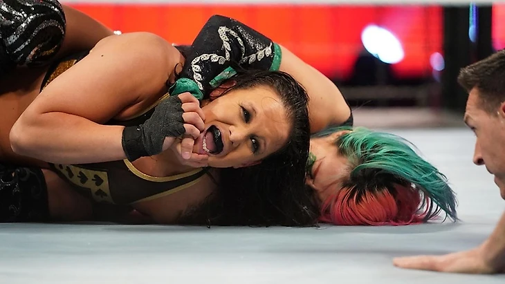 Зайдя в клетку, Шэйна прошлась мимо всех капсул и заглянула в глаза всем соперницам. Не то, чтобы ее кто-то боялся, но тем не менее. Начали матч Наталья и Райотт, и Руби сразу захватила контроль, даже попыталась свернуть соперницу, но отвлеклась на Морган, и позволила канадке отбиться, впечатав ту в стенку клетки. Снэп суплекс на маты за пределами ринга, и Шарпшутер прошел, однако Райотт реверсировала, отправив Нэтти спиной в капсулу Лив Морган. Забравшись на стенку, Руби провела сентон, с последующим удержанием в ринге, однако лишь до 2. Снова действо переместилось за пределы ринга, тут Наталья сумела поднять соперницу на плечи и провести что-то вроде электрического стула. Следующей в матч вышла Логан, и с ходу она провела двойные колени Наталье в капсулу Морган. Райотт решила сбежать от нее подальше, Сара отправилась за бывшей подругой, они оказались на капсуле, где Логан шарахнула поп-ап хэдбатт, и Руби стала сползать по цепи вниз, попав в дальнейшем под бомбу Натальи. Логан добавила кроссбади с верхотуры на обоих соперниц. Действо вернулось в ринг, и мы увидели классическую Tower of Doom на всех трех девушек, и к матчу присоединилась Бэзлер. Сразу же она стала разносить всех соперниц, провела слэм Саре, колено, применила Kirifuda Clutch, и Логан сдалась. Та же связка элиминировала Руби Райотт. Наталья же была уничтожена внутри одной из капсул, получила несколько раз дверью, Клатч прошел, и канадка сдалась. Редкие люди в толпе недовольно гудели, большинство молчали, и было слышно, как Аска прибывает на своей волне, издеваясь над Шэйной и привлекая к себе внимание (я же уже говорил, что Аска по-хорошему комична в такие моменты?). Время шло, а бывшая ММАшница спокойно отдыхала, ожидая следующей жертвы. Следующейучастницей матча стала Морган, которая провела пару атак, используя окружение, пока не попала под бомбу в стену клетки и swing в капсулу (это было очень жестко). Лив чуть-чуть оклемалась, но только для того, чтобы скушать колено в углу. Kirifuda Clutch на углу ринга, Лив не сдалась, но «уснула», и была элиминирована. Аска продолжала кричать, Бэзлер продолжала с ней заигрывать, и в итоге наступил момент, когда они сошлись в ринге под чанты «NXT!». Бут от Шэйны, Аска ответила хип атакой, отвесила кучу киков, но уже через мгновения стала получать колени. От слэма японка ушла, безуспешно попыталась провести сворачивание, и шарахнула хай кик. Тут же последовал Asuka Lock, потом она пресекла попытку Клатча и вновь поймала соперницу в свой болевой, и Шэйна укатилась за пределы ринга, поднялась с помощью стены «Чембера» и стала впечатывать соперницу в стену. Аска отказалась просто так сдаваться, налетела на оппонентку, но попала в болевой на травмированную руку. Попытка Клатча в ринге прошла, но Аска реверсировала, попала под кик, и вновь Бэзлер вернулась к атаке травмированной руки. Тот самый слэм, брутальное колено, Kirifuda Clutch, и командная чемпионка «уснула», а значит Шэйна победила, элиминировав 5 человек из 5 и повторив рекорд Брона Строумэна.