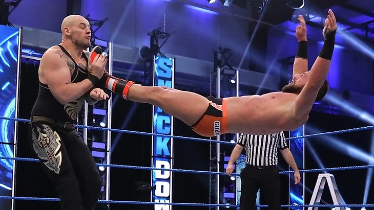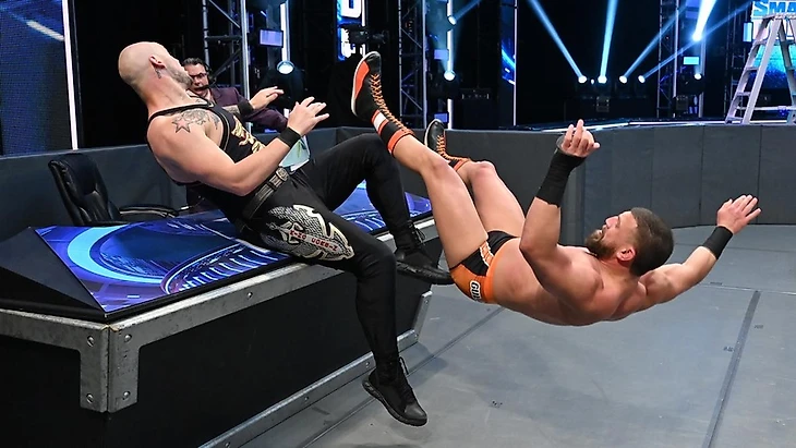 Корбин не стал напрягаться и сбросил Дрю с ринга, после чего заголосил. Дрю вернулся и с агрессивной миной принялся цепляться за "Короля", который разводил нытие на равном месте и не давал Гулаку как-либо зацепиться. Надолго панчей "Короля" не хватило - выпады от Гулака заставили Корбина уйти с ринга и тот перелетел через стол комментаторов после дропкика. Контроль Дрю оставался и после рекламы, однако одного клоузлайна Корбина хватило для сброски усилий Гулака в ноль. Бывший чемпион 205 Live пытался увести Бэрона в грэпплинг, но ничего не получалось, плюс Дрю получил back drop-фейсбастер - удержание вышло только до 2.