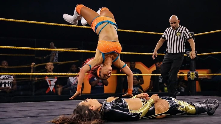 После рекламы чета Гаргано пыталась спорить с рефери из-за отсутствия у парней надлежащей экипировки. Джонни и Кэндис приготовились уходить и чемпион Северной Америки NXT решил вернуть тех силой. И это отчасти удалось: Гаргано был возвращён руками Кита, а Кэндис, благодаря самой себе на спине Ли и смекалке последнего, также оказалась на ринге. Фейсы дали понять, что они готовы и рефери дал команду на начало боя. Йим по-новой стала избивать Кэндис на легитимной основе после дропкика - в ход шли чопы и броски по рингу, а затем дошло до Seoul Food, но удержание оказалось только до 2. Дамы начали бороться в центре ринга, однако Йим отвлеклась на Джонни и ЛеРэй быстро поняла как надо действовать - она повредила правую ногу Мии и даже попыталась удержать, только вот фиксация пинфолла была неполной. В итоге Йим на время устранила с дороги Кэндис и принялась ругаться с Джонни - это снова чуть не аукнулось Мие, которая хотела отдавать тэг Киту, если бы не ЛеРэй. Последняя задержала Йим - и словила dragon-cуплекс, а чемпион Северной Америки был готов пройтись катком по Гаргано. Джонни уже был на грани поражения и его спас только тычок в глаза, а Миа из-за проверки состояния Ли попалась под сворачивание - и оно вышло до 3.