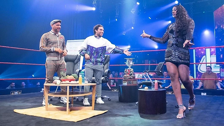 Если вы регулярно читаете наши обзоры, вы знаете (а если не читаете – сейчас узнаете), что я большой поклонник Supernova Sessions. Я защищал эти сегменты в любые времена, остался в восторге и от Тайлера Бэйта, жующего траву с пола, и от ГАЛЛОВ, саботировавших один из выпусков, и даже «черная дыра харизмы» Джинни на фоне мега-харизматичного Дара как будто была терпима. Но я не смогу найти слов, чтобы оправдать вот это. Это просто неспасаемо. Насколько крутые, милые и остроумные Ша с Даром, настолько же унылая, посредственная и скучная до зубовного скрежета Лэш Ледженд. Мисс Ледженд, имеющая в своем активе аж 14 (!) матчей, изо всех сил пытается копировать небезызвестную Бьянку Белэйр, только «круче». Я так понимаю, в NXT 2.0 промо-классы упразднили за ненадобностью, а сценария у SS на сей раз не было, потому что на фоне сыгранных, как по нотам, реплик и гэгов британцев все ее слова выглядели как бессвязный поток сознания. Это тот самый случай, когда человек произносит знакомые тебе слова, но ты все равно не понимаешь смысл им сказанного. Финальное послание – и я ставлю дачу Ромы на это – чистой воды импровизация, потому что такую феерию, как «жар слона, дикость гиены и скорость гепарда», просто невозможно нарочно прописать, такое можно придумать только на ходу, особенно если тебе 24 года, у тебя гиммик Бьянки Белэйр, 14 матчей в активе и ты вообще понятия не имеешь, как строятся промо в рестлинге. Респект со-ведущим, они правда старались разбавить все происходящее более-менее забавными гэгами и реально стоящими шутками (про Дэймона Кемпа так и вовсе нечто уровня BTE в хорошем смысле), однако зрители их просто уничтожили, хотя я уверен, что их пытались глушить «накладной» реакцией. «Отличное» начало эпизода NXT UK 2.0.