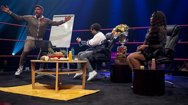 Наконец, начинается диалог. Ноам спрашивает Лэдженд, каково ей находиться рядом с чемпионом. Девушка говорит, что она сама себе ведущая, единственная и неповторимая, у нее много врагов, но и много друзей, для кого-то она горяча, а для кого-то – еще горячей. Сюда же она пришла не заводить друзей, она пришла за челленджем. Тут Дар вспоминает свои деньки на 205 Live и говорит, что всю ночь работал над особой презентацией для Лэш - подборкой лучших кадров с ней. На титантроне запускают видео-нарезку, по окончании которой Ша и Нам призывают зрителей подарить гостье стоячие овации. Дар спрашивает о планах Лэш на шоу NXT UK... и после шоу тоже. Параллельно он открывает бутылку с водой, которой тряс за пару секунд до того… и выясняется, что ему дали газированную воду вместо обычной. Чтобы замять инцидент, Ша приступил к разбору составленных им коэффициентов победных шансов гостей из 2.0 в NXT UK. В список, помимо Лэдженд (которая отпускала рандомные комментарии по ходу дела) вошли Фон Вагнер, Айви Найл и Дэймон Комп. Последнего ведущие довольно забавно обстебали насчет его ринг-нейма, сделав вид, что они не знают, кто это, но имя «звучит по-лузерски».