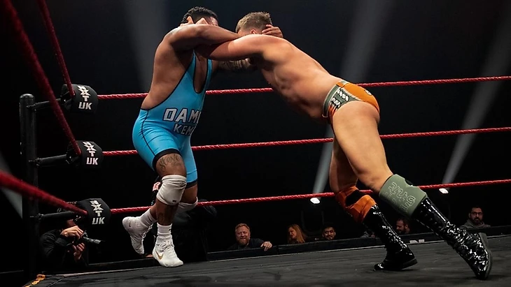 ПОЧЕМУ ЭТО НЕ МАТЧ ДЭЙМОНА КЕМПА, Б***Ь?????? Вашу мать, вы секунду назад показали, как Дэймон Кемп радостно обещает удивить Ша Сэмюэлса своим матчем и бежит по коридору – логично предположить – в зал. На ринг. Драться. Но нет, оказывается, что нас ожидает 4-минутное показательное выступление еще больших ноунеймов, чем Дэймон Комп (да, он брат Гейбла Стивсона, все дела, но для рядового фаната NXT UK он, простите, ноунейм из страны Ноунеймов). И, я думаю, вы все прекрасно знаете, чей продакшен это напоминает…
