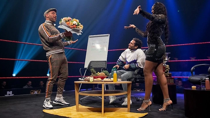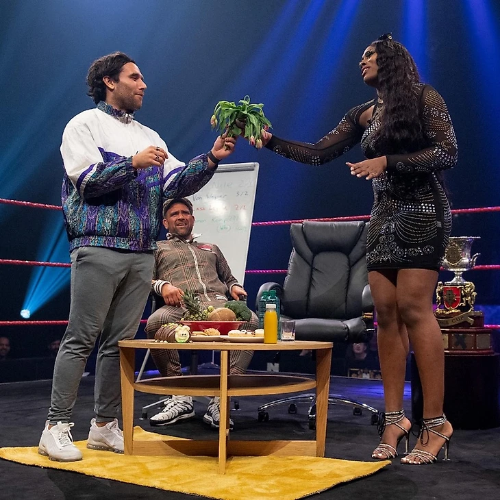 Последняя выходит к рингу, где уже все обустроено под антураж нашего любимого ток-шоу, под восторженные комментарии со-ведущих. Правда, на ринге возникает неувязочка, когда оказывается, что оба сидячих места заняты, хотя Ноам, по словам возмущенного Сэмюэлса, обещал, что они будут джентльменами. Мясник из Ист-Энда спешит предоставить даме свое кресло, попутно старательно протерев его своей кепкой, а Дар божится, что он предупреждал съемочную группу об этом. Далее следует казус с цветами, которые обладатель Кубка Наследия принимает из рук ассистента – увядшие тюльпаны, которым, по мнению Дара, требуется «немного воды… может быть, несколько галлонов». Лэш принимает букет из рук шотландца, отмечая, что и попытка считается. Ша оказывается более находчив и вручает гостье очень даже презентабельный букет… который гостья помещает прямо в Кубок Наследия.