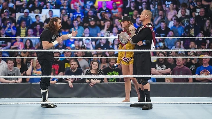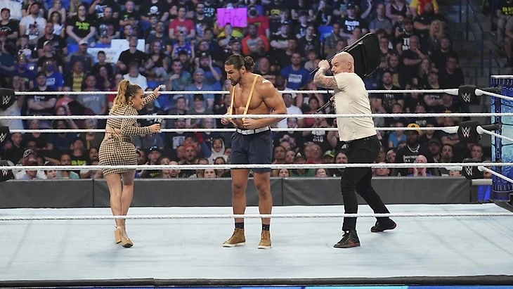 — Перед финальным выходом The Bloodline на ринг для речи про вызов от RK-Bro, Сэми Зейн пытался объясниться за свои действия сегодня и убедиться, что фиаско Сэми не повлияет на атмосферу сотрудничества между ними. Зейн чётко давал понять,что остаётся единственным лояльным человеком для Романа Рейнса и тем, кто способен ему помогать на синем бренде дальше. Хейман выслушивал это всё с большой долей скепсиса, но дал понять что Глава Стола ценит усилия Сэми и не пропускает мимо себя ничего из того, что старается делать Зейн для The Bloodline. После рекламы состоялся выход The Bloodline и Роман Рейнс принялся рассуждать о том, что же дальше для его семьи? Ибо для него лично всё уже решено — ибо он неприкасаем, а те кто пытался сделать и утверждать обратное, остались позади (таковыми он назвал Джона Сину, Брока Леснара и даже Дрю Макинтайра, мол каждый из них хотел встать на место Рейнса, но Роман их побеждал и задавал себе вопрос «Что будет дальше?»). Отчего Роман и решил переключить внимание на своих кузенов, командных чемпионов синего бренда, ибо его волнует вопрос отсутствия для них конкурентов. Тут объявились RK-Bro со своими вопросами и пожеланиями. Перед этим Ортон упрекнул Рейнса в том, что он никогда не станет той самой сверхновой звездой уровня Джона Сины, которым последний был даже 10 лет. Риддл же выдал байку о том, как он проводит свои вечера дома... переведя суть своей речи к анализу старых матчей, особенно того что был неделю назад на WrestleMania Backlash. Затем RK-Bro вместе напомнили Усо о том, что те не способны даже слова своего высказать без одобрения Романа Рейнса. Хотя у них же проблема ещё и в том, что они же близнецы и у них одна извилина на двоих, что вдвойне проблематично при обсуждении серьёзных вопросов (Ортон тут позволил себе медленно произнести свою речь). В конечном итоге RK-Bro вернулись к своему вопросу ответного вызова на их общий бой за оба командных титула — им нужен чёткий ответ от Усо, именно от них. И Усо подали свой голос, ответив что принимают этот вызов на следующую неделю, когда будет решена судьба обоих командных титулов. Также Усо внятно дали понять, что именно они станут теми, кто будет гордо носить звание неоспоримых командных чемпионов WWE, разделив лучи этой славы со своим братом, Романом Рейнсом. Последний поднял оба своих титула... и словил удар коленом в лицо от Риддла. RK-Bro снова вышли из ситуации довольными своими действиями, а The Bloodline показали что теперь RK-Bro точно не жить после такой дерзости, хотя сам Рейнс постарался сохранить лицо и здравый рассудок. На этом моменте шоу вышло из эфира