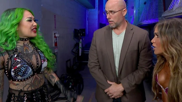 (Сегмент-прожарка, причём с обеих сторон. Но если со стороны Рейнса и остальных был чисто по классике, что не особо примечательно и интересно честно говоря, то вот RK-Bro по сути продолжили начатое в самом начале выпуска. И получили особый манёвр вдохновения, получив свой отдельный Face-to-Face с The Bloodline. Но ключевая тут цель отчасти даже не то, что матч за унификацию титулов всё-таки был назначен, пусть и на следующий выпуск — тут случилось то, что в потенциале у Рейнса помимо Накамуры и даже Макинтайр нарисовались новые личные противники в лице Ортона и Риддл. И видимо Мэтт будет первой целью для Рейнса в будущем, возможно даже и на HIAC, чтоб растянуть время. Тем более в отсутствие самого Макинтайра, что будет недолго конечно. Да и вывеска Рейнс-Ортон за неоспоримое чемпионство Вселенной для Money in the Bank – вполне себе статусная во всех смыслах, сколько не опротестовывай. Плюс и сам сегмент выдался любопытным, в чём-то и забавным, да и Усо впервые за долгое время выдали голос, не получив негатива от своего Вождя. Хотя бой за унификацию будет сорван в любом случае, ибо матч не для еженедельника, тем более с пачкой PLE на всё лето и даже самое начало осени).