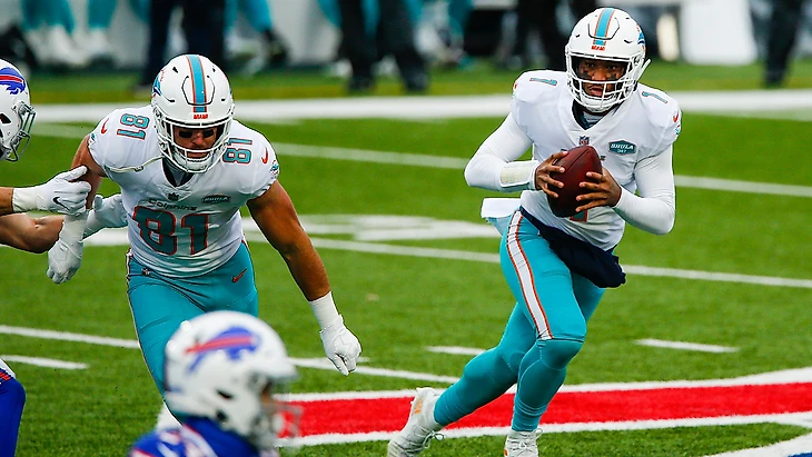 Итак, Dolphins в первом раунде драфта под шестым номером взяли Джейлена Уэддла. Уэддл довольно скоростной ресивер (40 ярдов за 4.37 сек.), скорее всего его будут использовать в слоте. Напомню, что Уэддл и Туа оба выходцы из университета Алабамы. Они прекрасно знакомы друг с другом, так что это огромный плюс, как и для новичка ресивера, так и для не до конца окрепшего квотербека. Также Dolphins подписали годовой контракт с Уиллом Фуллером, бывшим ресивером Texans. Фуллер (40 ярдов за 4.32 сек.), как и Уэддл, очень быстрый ресивер, так что со скоростью у Dolphins проблем не будет. А вот с надежностью и стабильностью не ясно. Ни Фуллер, ни Паркер в прошлом году не набрали 1000 ярдов, и ни один из них не сумел принять участия во всех 16 матчах из-за травм. Задрафтовали Dolphins и тайт-энда Хантера Лонга. Лонг позиционируется как принимающий тайт-энд, в прошлом сезоне за Boston College он поймал 57 пасов на 685 ярдов и 5 тачдаунов.