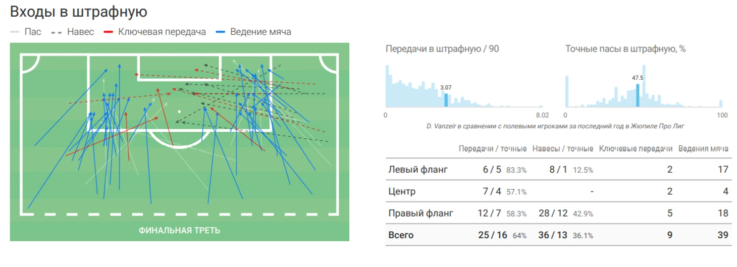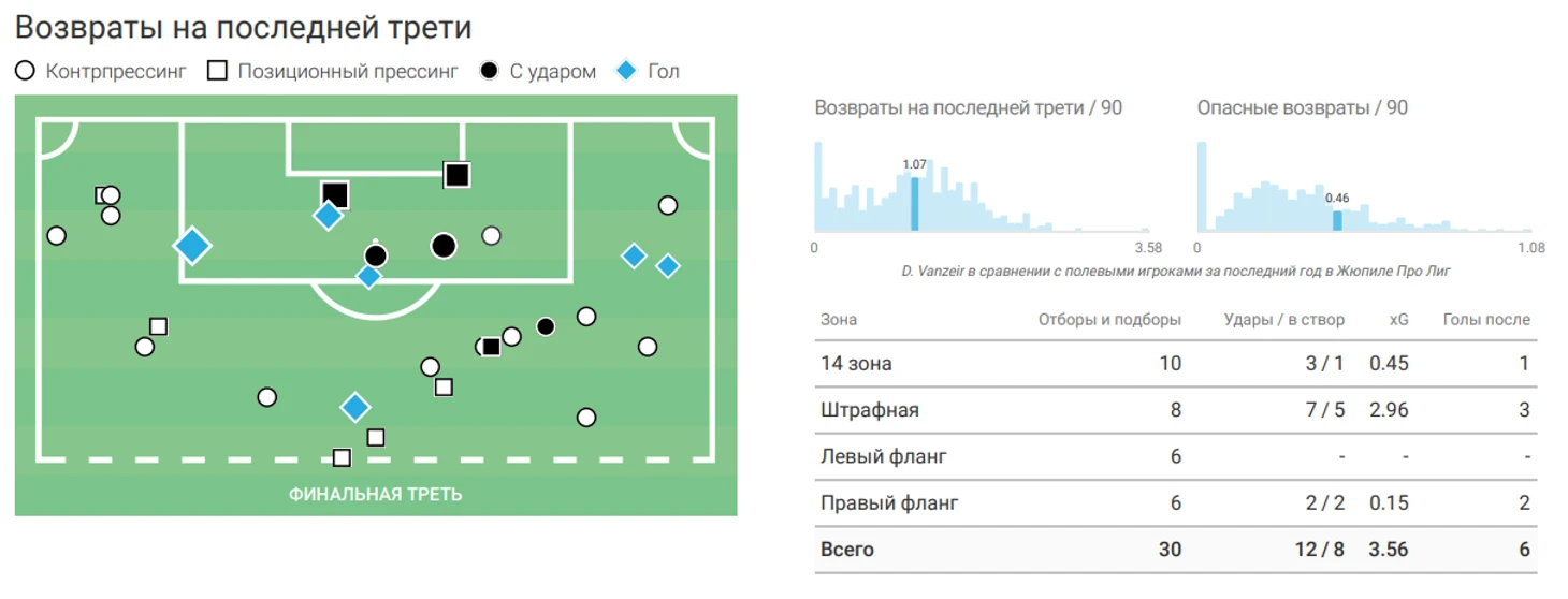 5) Разноплановость. Ванзейр привык играть в паре нападающих, может подстраиваться под партнёра (их связка с Денизом Ундавом — блеск). По ходу встречи может отходить правее, искать свободные зоны для проникновения в штрафную. Комфортно чувствует себя в разных ролях, много играл оттянутым форвардом.