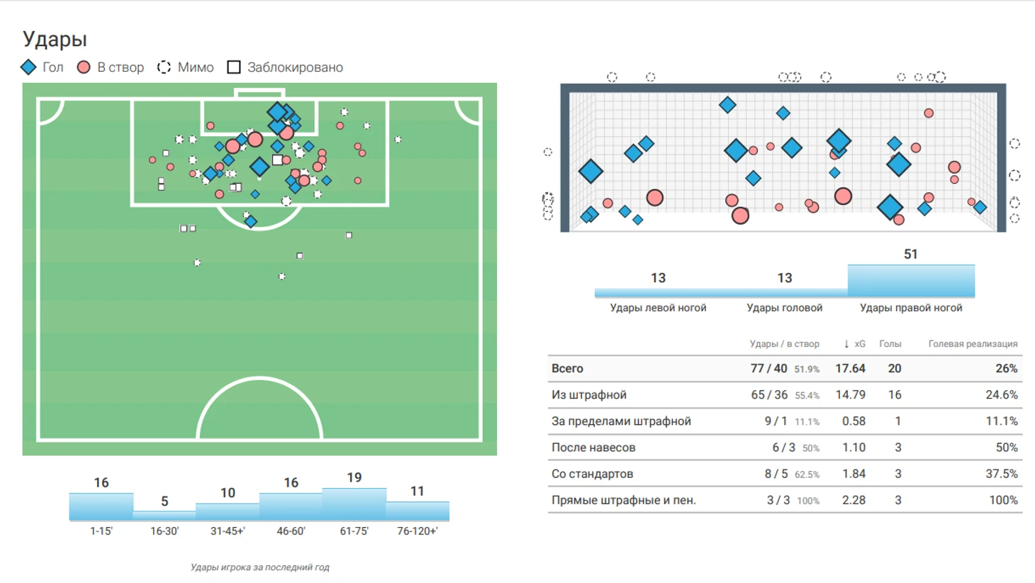 3) Реализация моментов. Данте бьёт достаточно редко для нападающего — 2.53 удара в среднем за матч. Но 50(!) процентов идёт в створ, сумасшедшие цифры. Его xG на взрослом уровне — 40.07, а голов забито 49. Отличные цифры