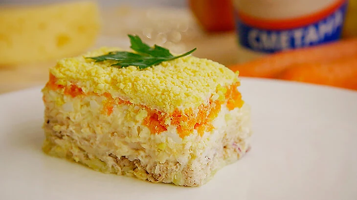 Как готовить: сварите овощи и яйца, рыбу разомните вилкой. Отделите желтки от белков и натрите их на терке для украшения салата. Натрите на терке сыр, овощи и белки яиц, добавьте к этой массе рыбу и заправьте сметаной. Выложите на тарелку, сверху добавьте ровный слой тертой моркови, на него – тонкий слой сметаны, украсьте измельченными желтками. Уберите в холодильник на час-полтора, чтобы дать салату пропитаться. Вы также можете выкладывать салат слоями, как это принято в классическом рецепте.