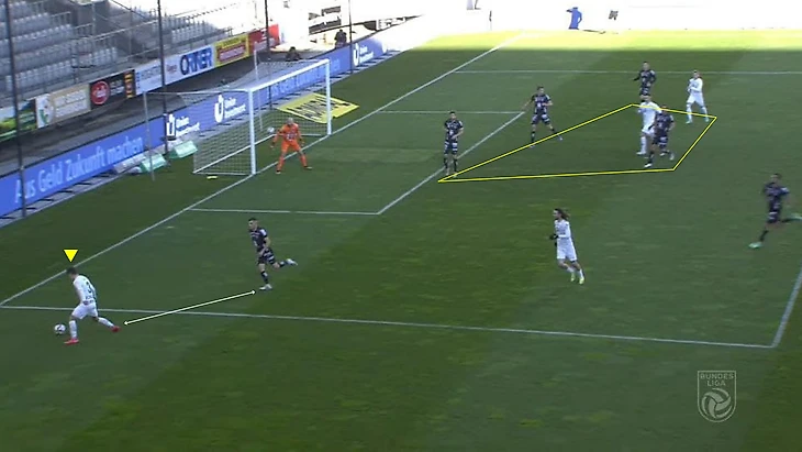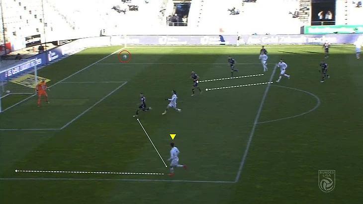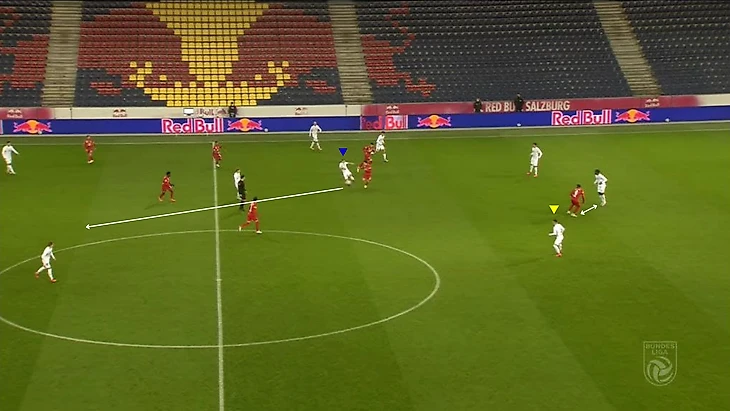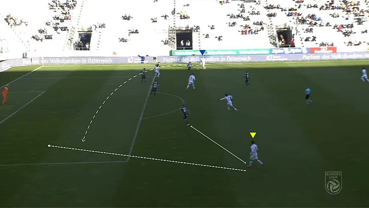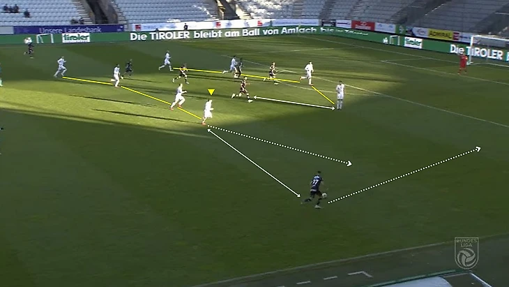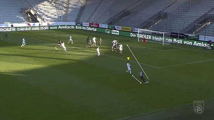 Игрок Тироля (помечен синим треугольником) собирается сделать проникающий пас. Классен играет в обороне крайнего левого защитника. Ситуация в защите 1 в 3. Численный перевес на стороне игроков Тироля