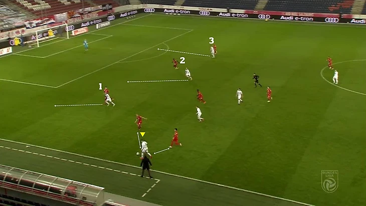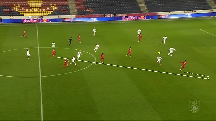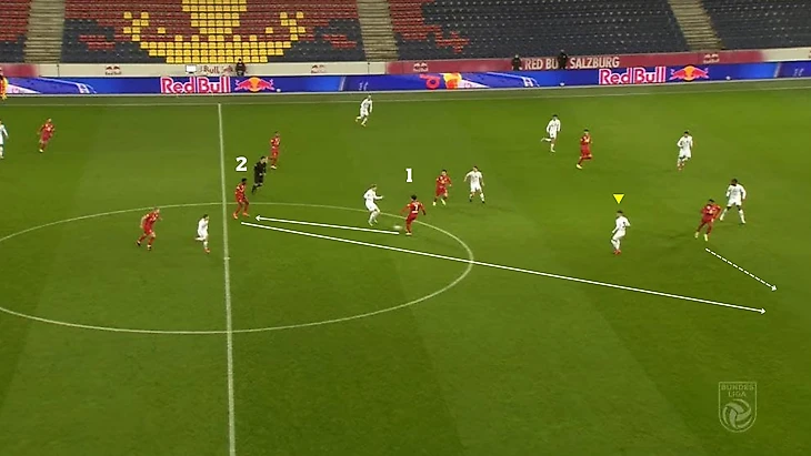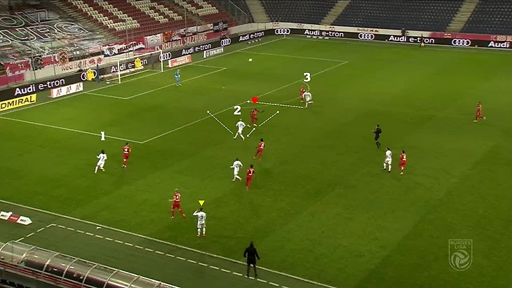 На фото номер 2 видно, что как только Классен получает мяч, он оказывается под давлением двух игроков Зальцбурга, но время на принятие решения все же есть. У Леона три варианта для продолжения атаки. Первый вариант- отдать пас на игрока "1" и продлить атаку через фланг. Второй вариант- навес на игрока "2". И последний вариант- навес на игрока "3"