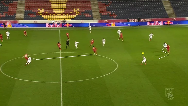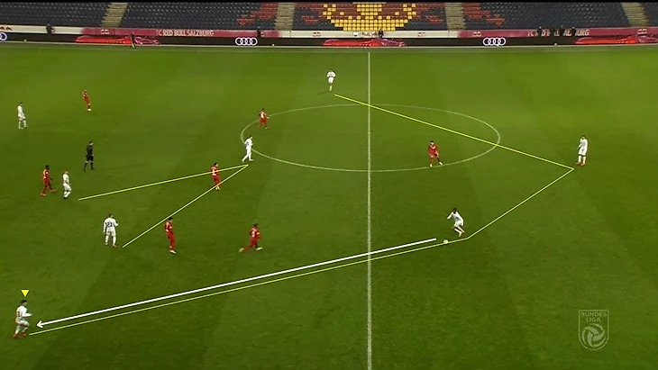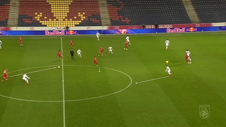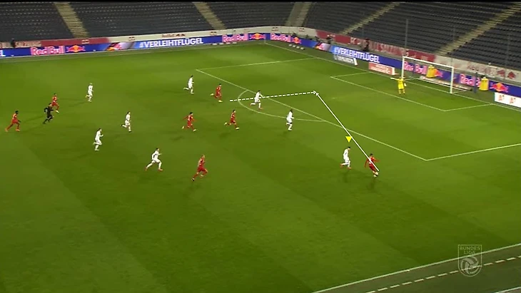 Начнем с игры 18 тура. РБ Зальцбург- Тироль. Обозначение на карте: желтый треугольник- Леон Классен, красный треугольник- защитники, пунктирная линия- движение игроков, обычная- пасы