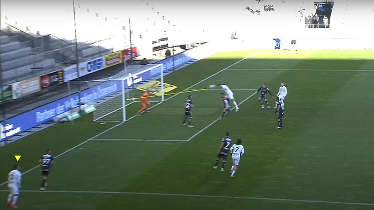 В результате позиционной ошибки, игрок Вольфсберга совершает навес без сопротивления. Результатом навеса станет опасный удар. Этот эпизод показывает нам слабую позиционную игру в обороне