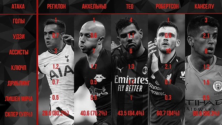 Статистика дает нам понять, что Тео, на фоне лучших левых защитников, выглядит неплохо. По оборонительным показателям француз не уступает почти ни в каких компонентах. Атакующие показатели так же впечатляют