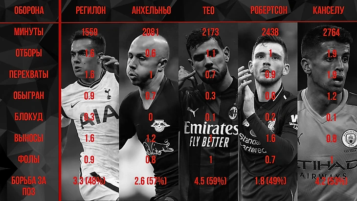 В обороне Тео выделяется только количеством единоборств за игру. Он в среднем 4.5 раза вступает в борьбу и выигрывает 60% единоборств. Канселу вступает 4.2 раза, не сильно меньше, однако всего в 53% единоборствах он одерживает победу