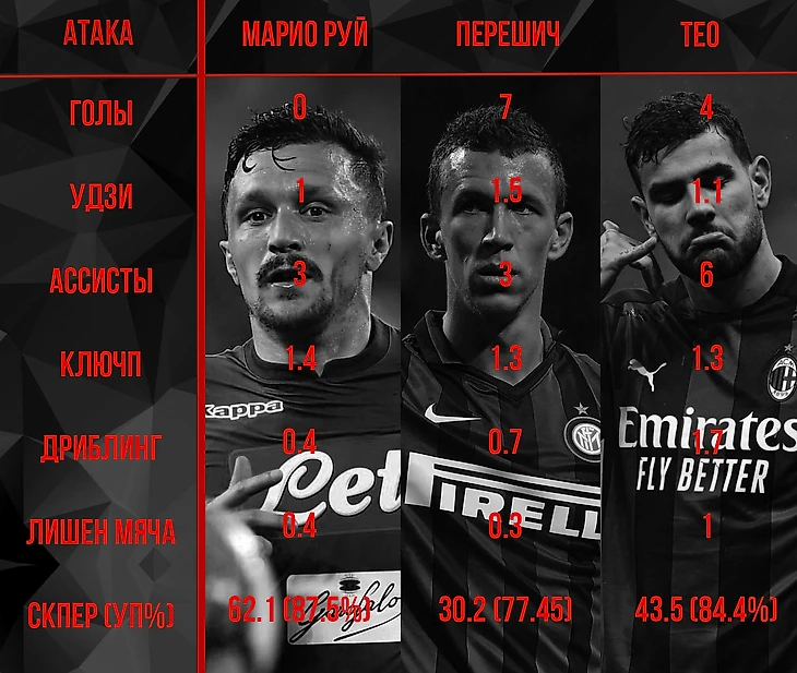 Мы долго думали о том, с кем из Серии А сравнить Тео Эрнандеса. В итоге решили взять Перишича и Марио Руя, так как именно между «Миланом», «Интером» и «Наполи» сейчас разыгрывается чемпионство. На фоне своих конкурентов Тео выделяется тем, что его намного реже обыгрывают. В остальном Тео либо на одном уровне, либо немного проигрывает