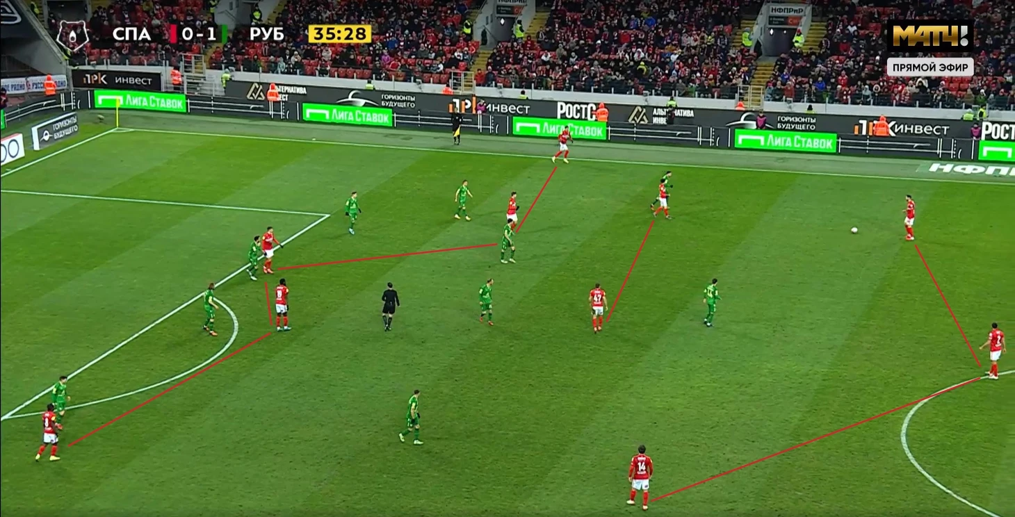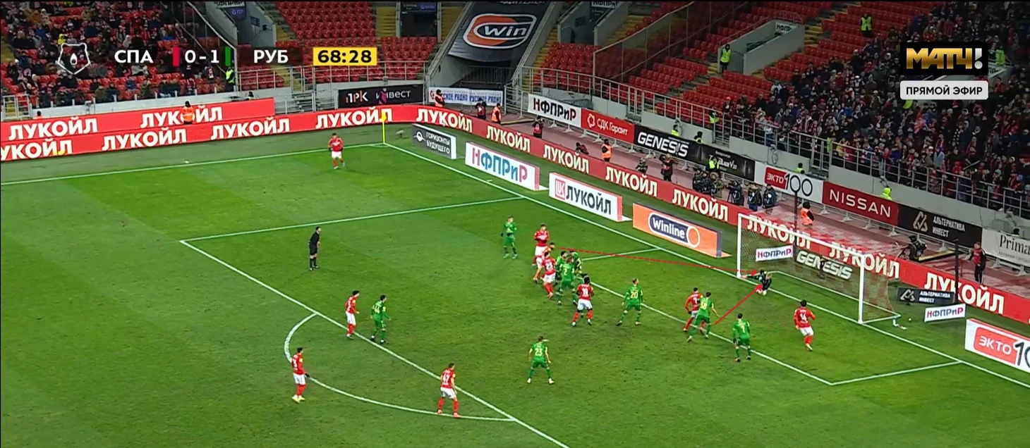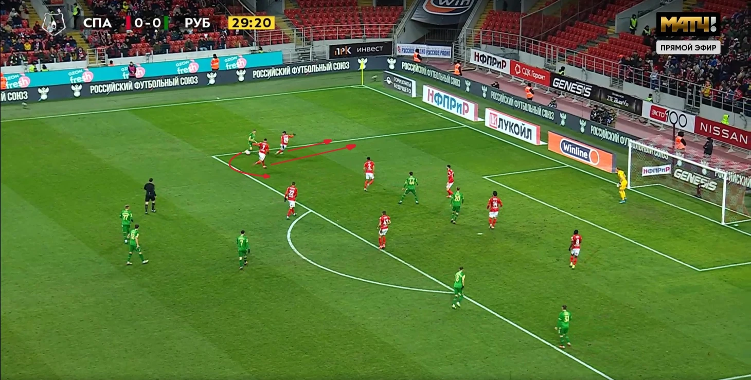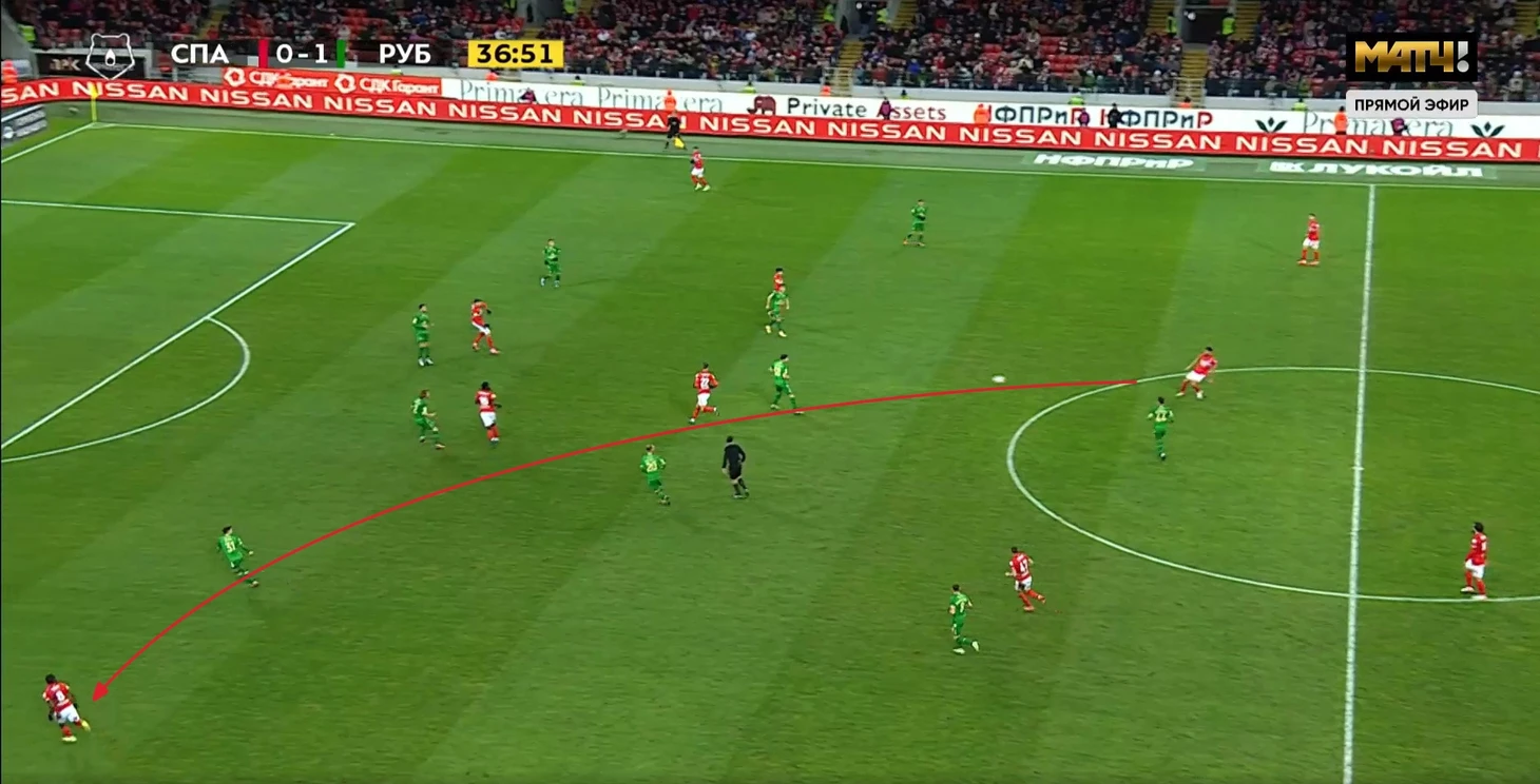 4. Длинные передачи Спартака. В этом матче футболисты Красно-белых постоянно делали дальние передачи. В этом был определенный смысл. Во-первых, таким пасам на Мозеса и Хлусевича Спартак преодолевал оборонительные ряды Рубина: