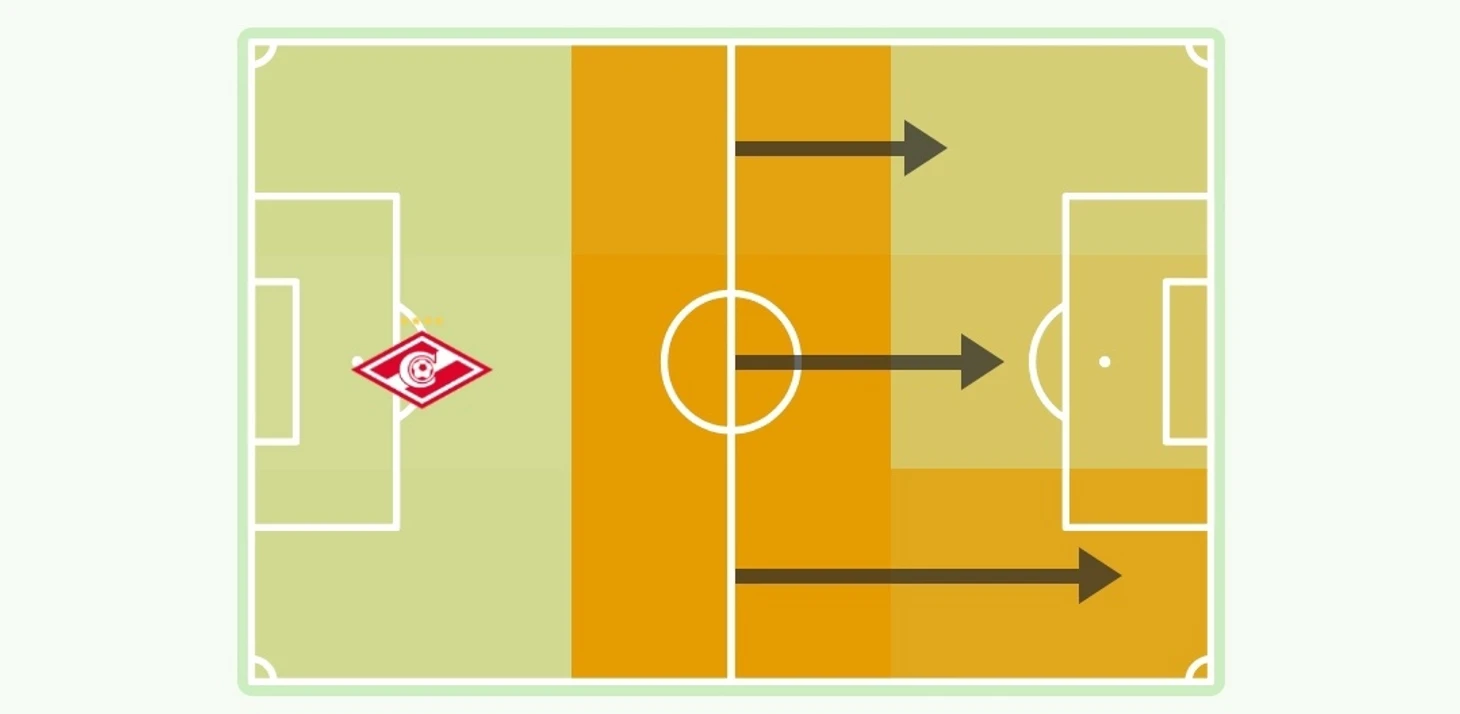 Во-вторых, это позволяла Спартаку быстро менять фланги атаки. А так же длинные передачи передачи это часть тактики Ваноли и в матче против Тулы одна из таким передач привела к голу