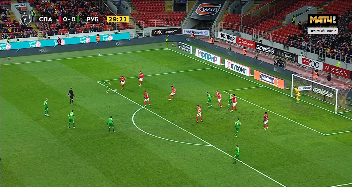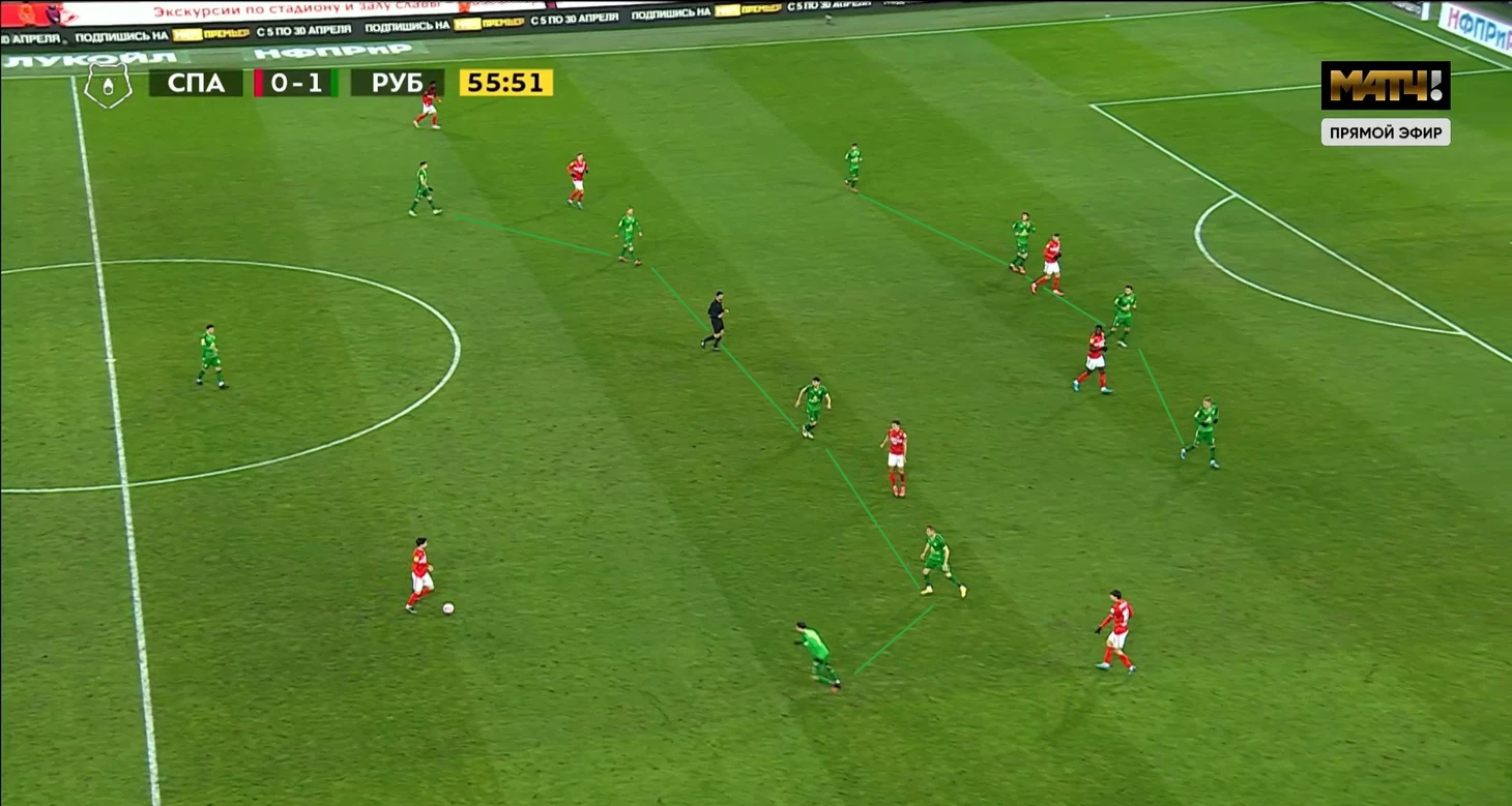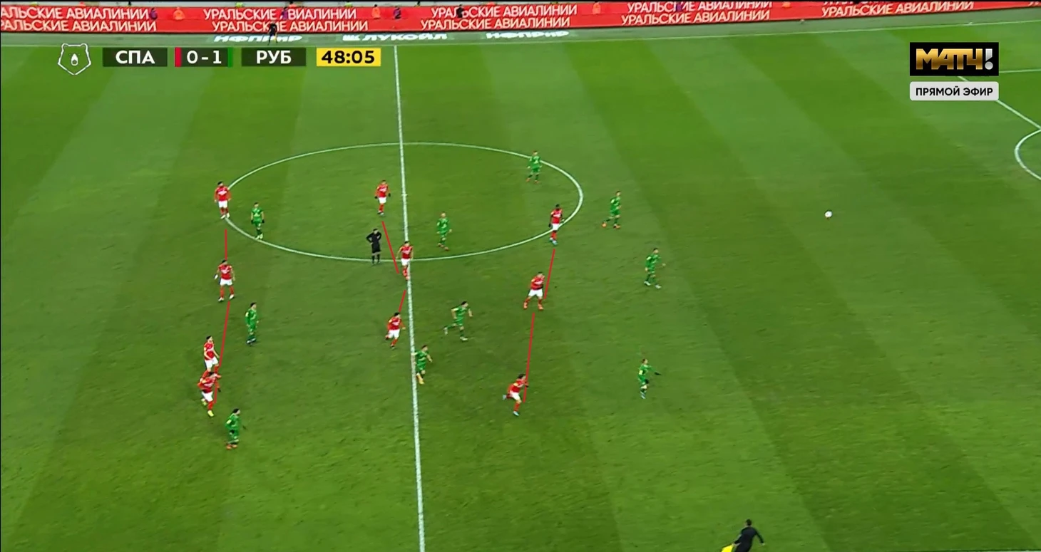 5. А где прессинг Спартака в первом тайме? В матче против Тулы я хвалил оборону и контрпрессинг Спартака. Однако в этом матче все куда делось. Команда просто откатывалась назад и садилась в оборону
