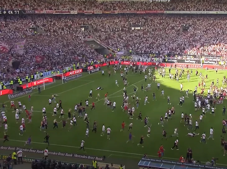 После финального свистка на поле выбегают фанаты и начинают праздновать победу: