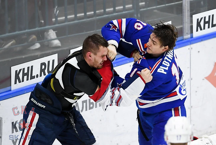 В итоге драка уже на первой минуте периода. Плотников (187 см, 100 кг) стянул майку соперника и нанес заметно больше ударов, хоть и не все пришлись в цель. Брынцев (193 см, 98 кг) же старался сдерживать руки капитана СКА, и в конце боя воткнул его в борт и повалил на лед.
