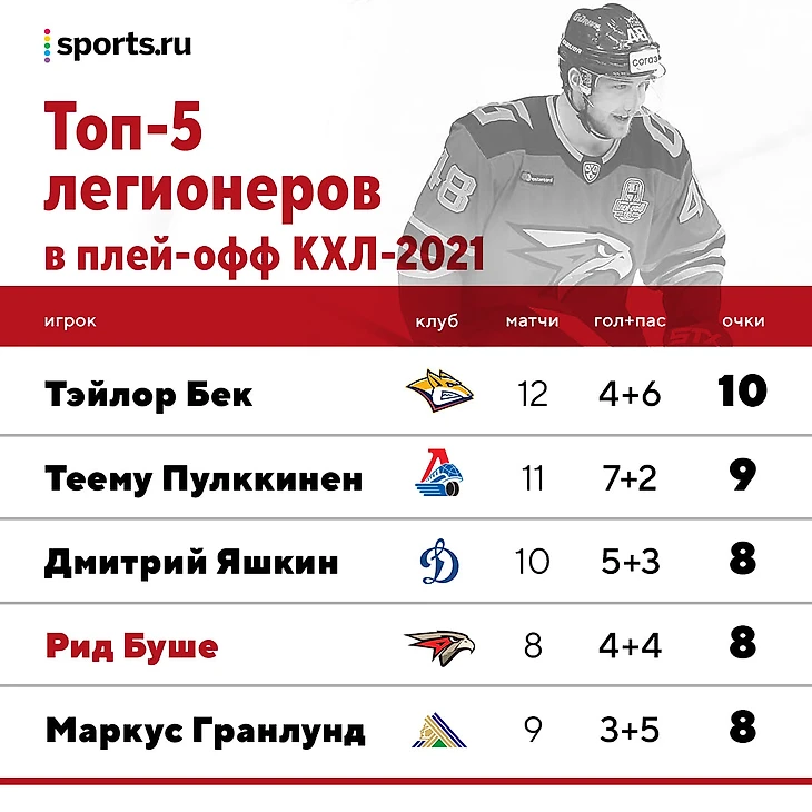 Нет, в заголовке нет никаких ошибок. Буше действительно лучший легионер, который добрался до финала конференции. Финское трио из Уфы, Пулккинен и Тейлор Бек уже отправились отдыхать, а у американца 8 очков за 8 матчей и очень хорошее настроение перед зарубой с «Ак Барсом».