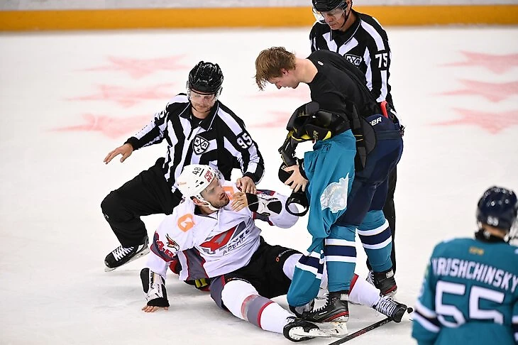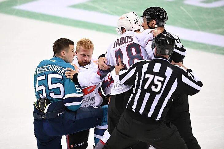 Но и это было еще не все. Никита Зоркин прям на точке вбрасывания начал танцевать с Сергеем Алхимовым – еще одна победа «Авангарда».