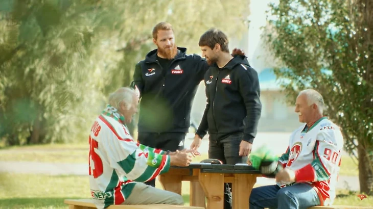Любовь Павла Дедунова к рыбалке обыграли битвой в домино против двух старичков в джерси «Ак Барса» – один из них с фамилией Зарипов (лидеру казанцев уже 41, он объявлял о завершении карьеры, но так и не ушел).