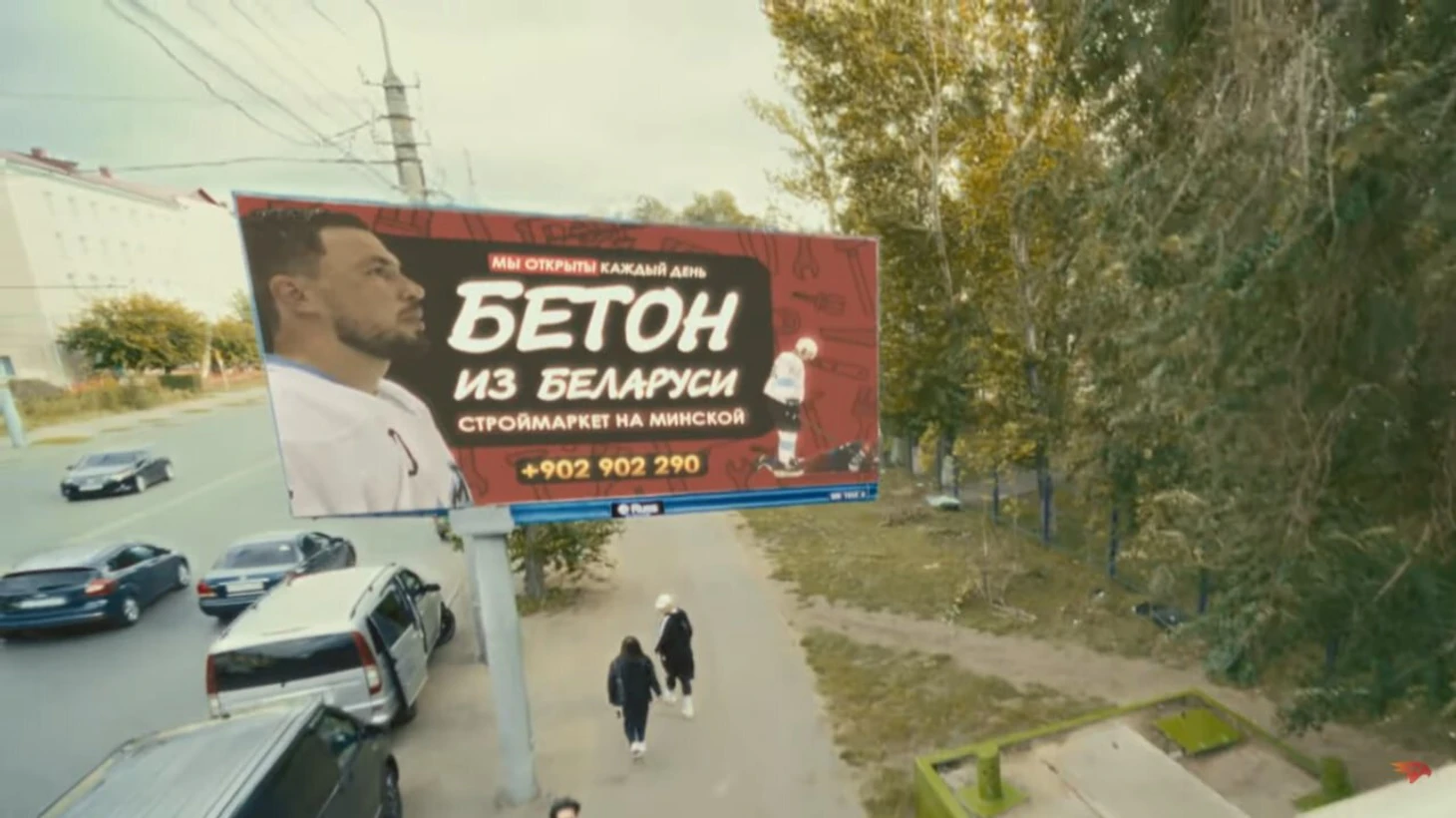 Рядом с беляшной – рекламный щит «Бетон из Беларуси», на котором изображен экс-защитник «Авангарда» Алексей Емелин, перешедший этим летом в минское «Динамо» и уже успевший хитануть даже главную восходящую звезду России.