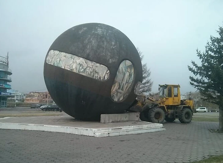 Затем камера облетает уже известный вам шар Бухгольца – он же памятник «Держава».