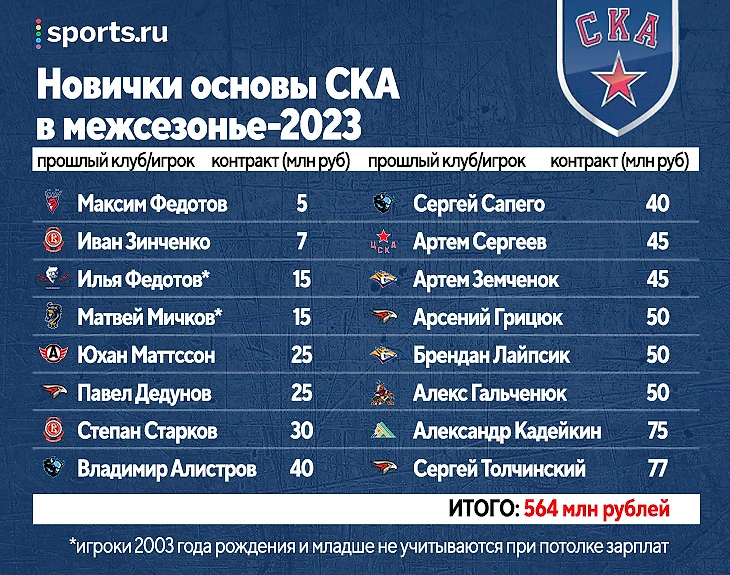 Понятно, что все игроки, представленные выше, приходили в разный момент межсезонья (к тому моменту СКА уже кого-то и отпускал), но общая сумма их контрактов в платежке-2023/24 – 564 млн. Без учета тех, кто еще попадает под лимит – как вернувшийся тогда из аренды Мичков или новичок Илья Федотов. При этом были и другие новички – типа Соболевского, Шеховцова, но мы учитывали только тех, кого брали в главную команду.