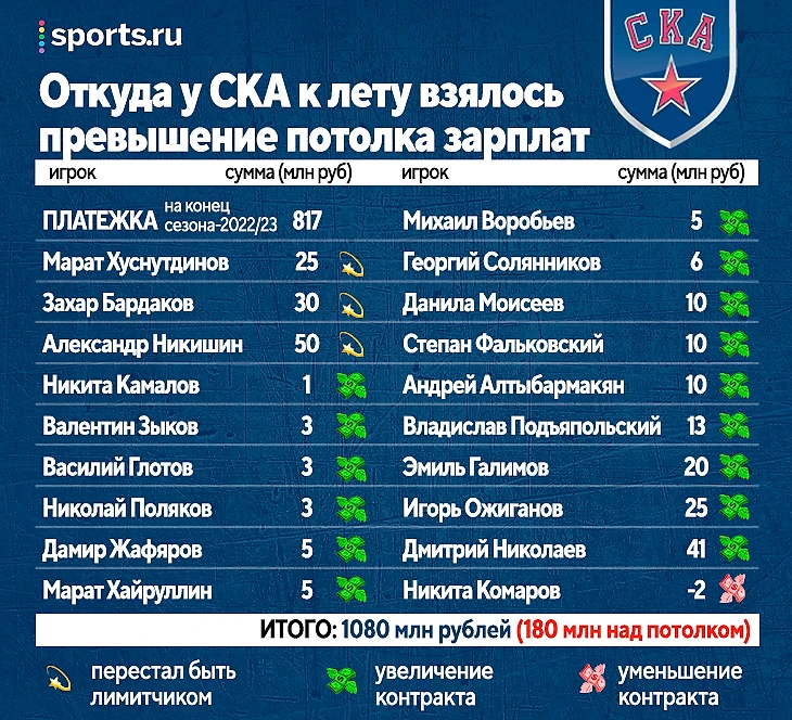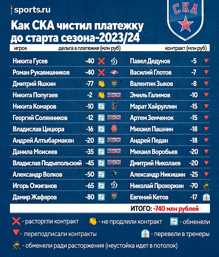 ● Простым расставанием – не предлагали новый контракт или расторгали старый. К концу сезона у СКА было только два НСА – Яшкин и Кетов, который завершил карьеру. С одной стороны – конкуренты не смогут никого увести, с другой – потом вот такие беды с потолком.