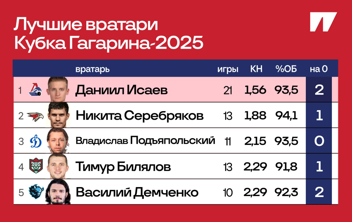 Допроверялись. Исаев за весь финал пропустил 6 шайб – он лучший по коэффициенту надежности, делит лидерство с Демченко по сухарям и второй – по отраженным броскам (на момент старта 5-й игры – актуальные цифры обновим чуть позже).