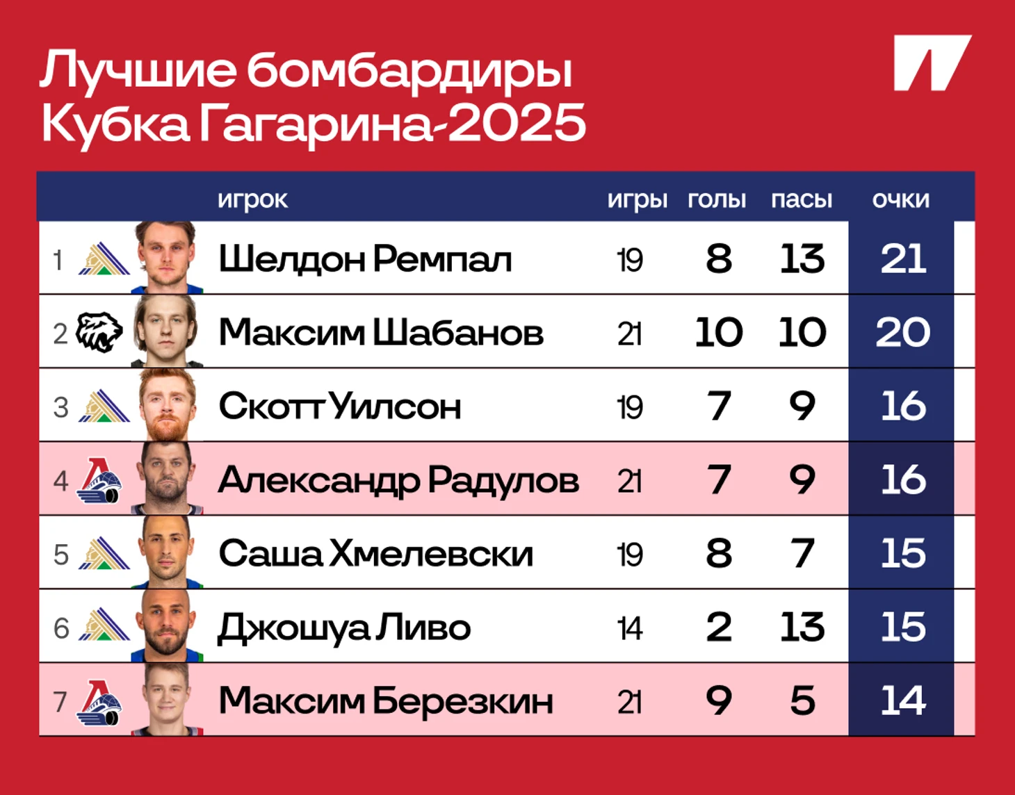 Весь плей-офф-2025 Ярославля уложился в 21 матч (могло быть меньше, но там до последнего упирался «Авангард») – относительно быстро, особенно если учесть, что у «Салавата», попавшего под «Локо» в полуфинале, было две семиматчевые серии. Так что в итоговой таблице бомбардиров не то чтобы много игроков из финала. В топ-7 – всего двое ярославцев: Березкин, и разумеется, Радулов.