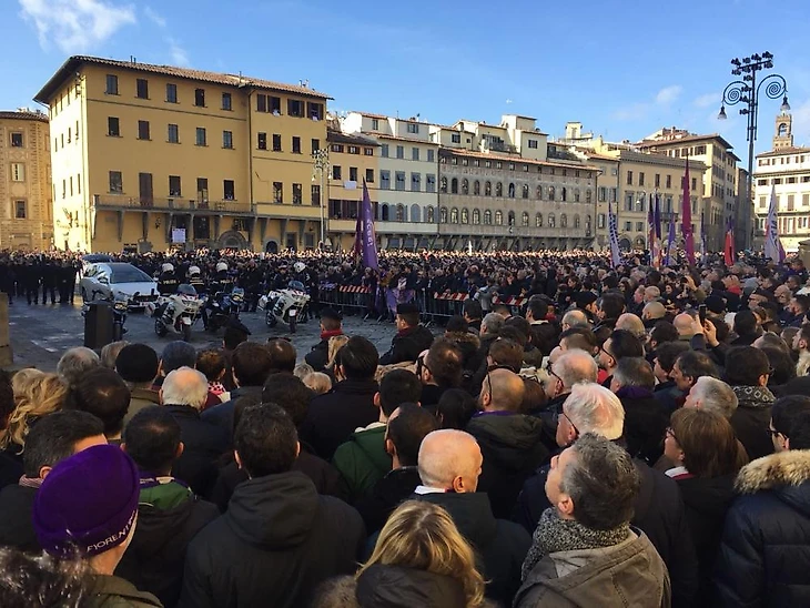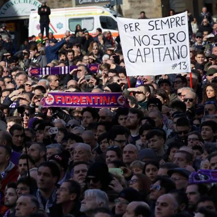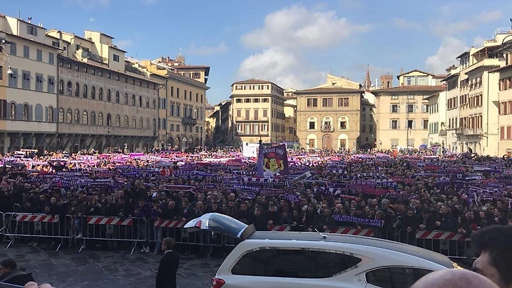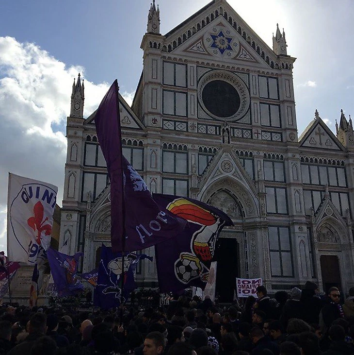 На площади перед базиликой собралась вся Флоренция: как болельщики, так и обычные горожане пришли сегодня на площадь, чтобы почтить память Астори и проводить его в последний путь. Тело капитана будет предано земле в городе, где он родился, — коммуне Сан-Пеллегрино-Терме.
