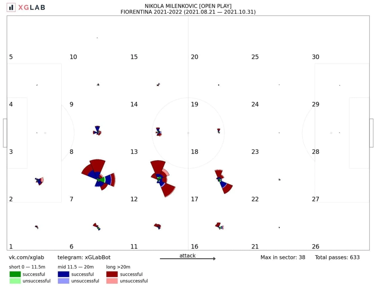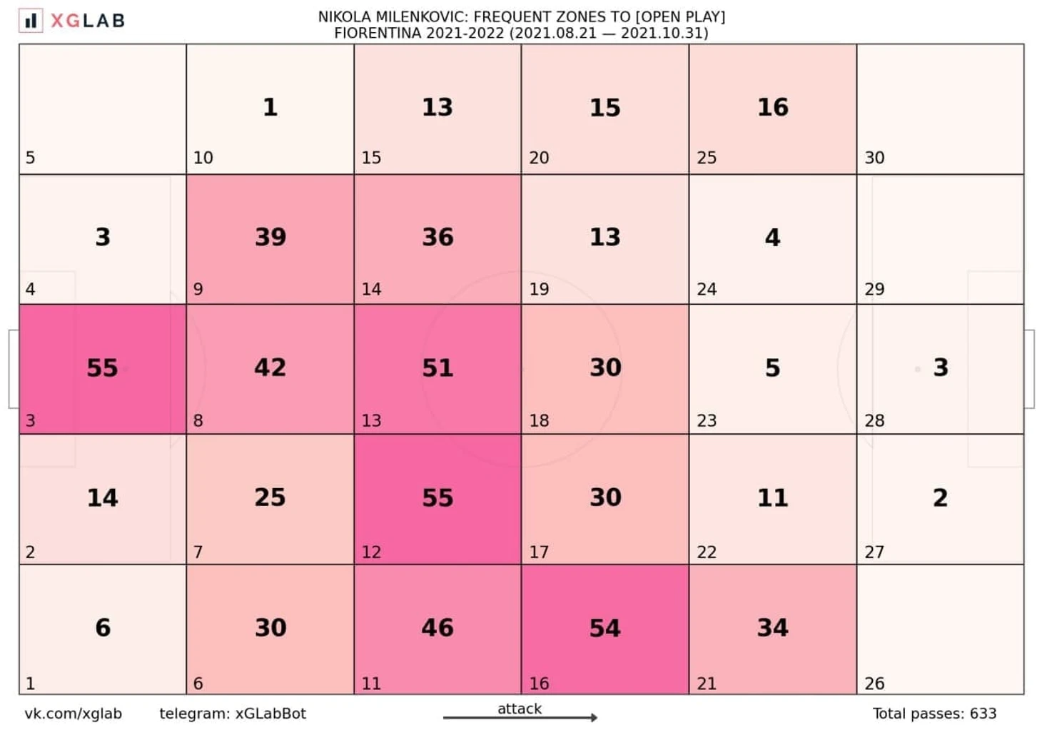 Всех вышеназванных игроков объединяет возможность безошибочно переводить мяч с фланга на фланг и отдавать длинные диагонали. Отдельно восхищает Миленкович — визуальные впечатления прекрасно соотносятся с данными. Просто взгляните на карту зон.