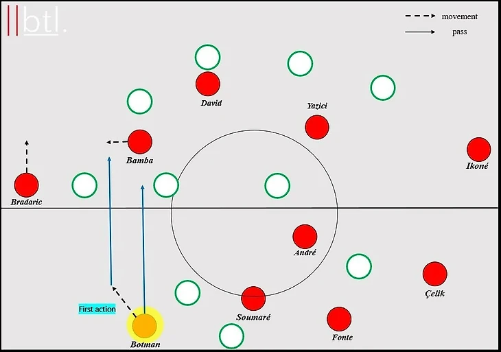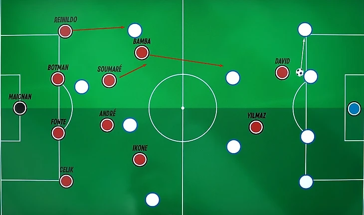 Если центральный защитник соперника получал мяч на границе своей штрафной площади, то к нему поднимался один из форвардов «Лилля» (Дэвид), провоцируя пас на флангового защитника. Таким образом, он оказывал давление на мяч и закрывал одну из линий передач в центр поля. Другой форвард (Йылмаз) при этом выходил опекать дальнего относительно мяча центрального полузащитника. Игроки центра поля поднимались вслед за форвардами для поддержки прессинга. Главная цель – не дать сопернику вывести мяч в центр.