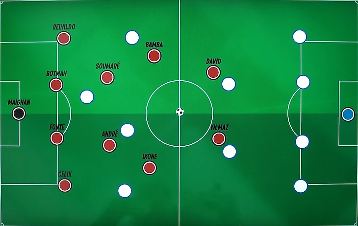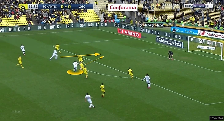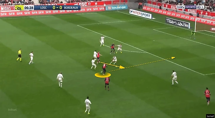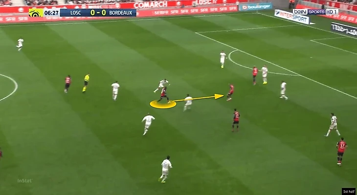 Благодаря собственному широкому расположению на фланге и стремлению «Лилля» в целом нагрузить финальную треть соперника как можно большим числом игроков, Иконе получил еще больше пространства и, как следствие, непредсказуемости. Резкие развороты при приеме с уходом в свободное пространство, смена скорости движения с мячом без потери способности его плотно контролировать и сбивающие оппонента с толку переступы – арсенал француза позволял ему выглядеть эффектно и быть эффективным для команды. Надо отметить и то, что Иконе неплохо держал баланс при попытке отобрать у него мяч, что позволяло ему смело идти вперед без боязни быть вытесненным из эпизода.