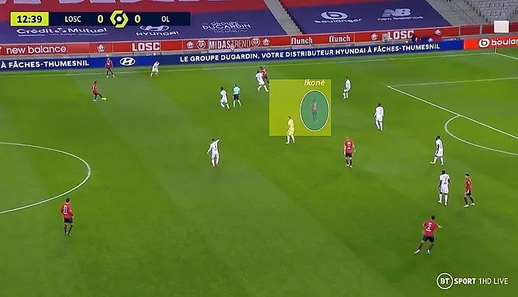При обороне вовлеченность Иконе была чуть ли не минимальной в команде: «Лилль» использовал компактную расстановку 4-4-2 без мяча, не стремясь интенсивно прессинговать (10,77 PPDA, 13-й результат в лиге в том сезоне). Верхняя двойка состояла из форварда и Иконе: они практически не оказывали давления на защитников соперника. Если же эпизод требовал включения в прессинг, то чаще всего это делал именно нападающий.