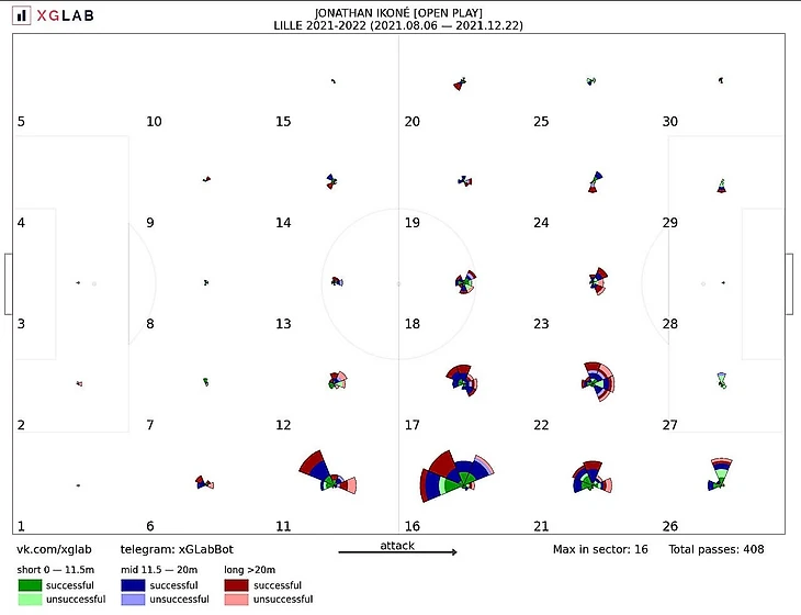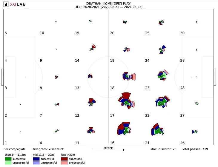Более частое появление справа также было обусловлено нахождением в этой зоне Николя Пепе и активностью правого крайнего защитника Зэки Челика на фланге: через эту вертикальную треть проходило 43% атак команды. Здесь стоит упомянуть и о любви Иконе к смещениям с фланга в центр с мячом под более комфортную левую ногу.