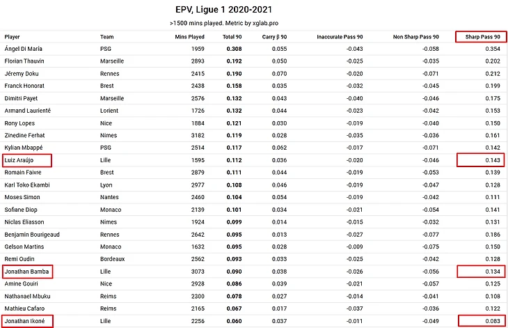 Если сравнить Иконе с конкурентами по «Лиллю», то результат тоже удручает: Луис Араухо набил 0,112 EPV, Бамба – 0,09, а француз – лишь 0,06. При этом нельзя сказать, что Иконе делал много неточных пасов или получал большие штрафы за загубленные атаки: у него идентичные конкурентам показатели во всем за исключением непосредственно вознаграждения за обостряющие передачи.