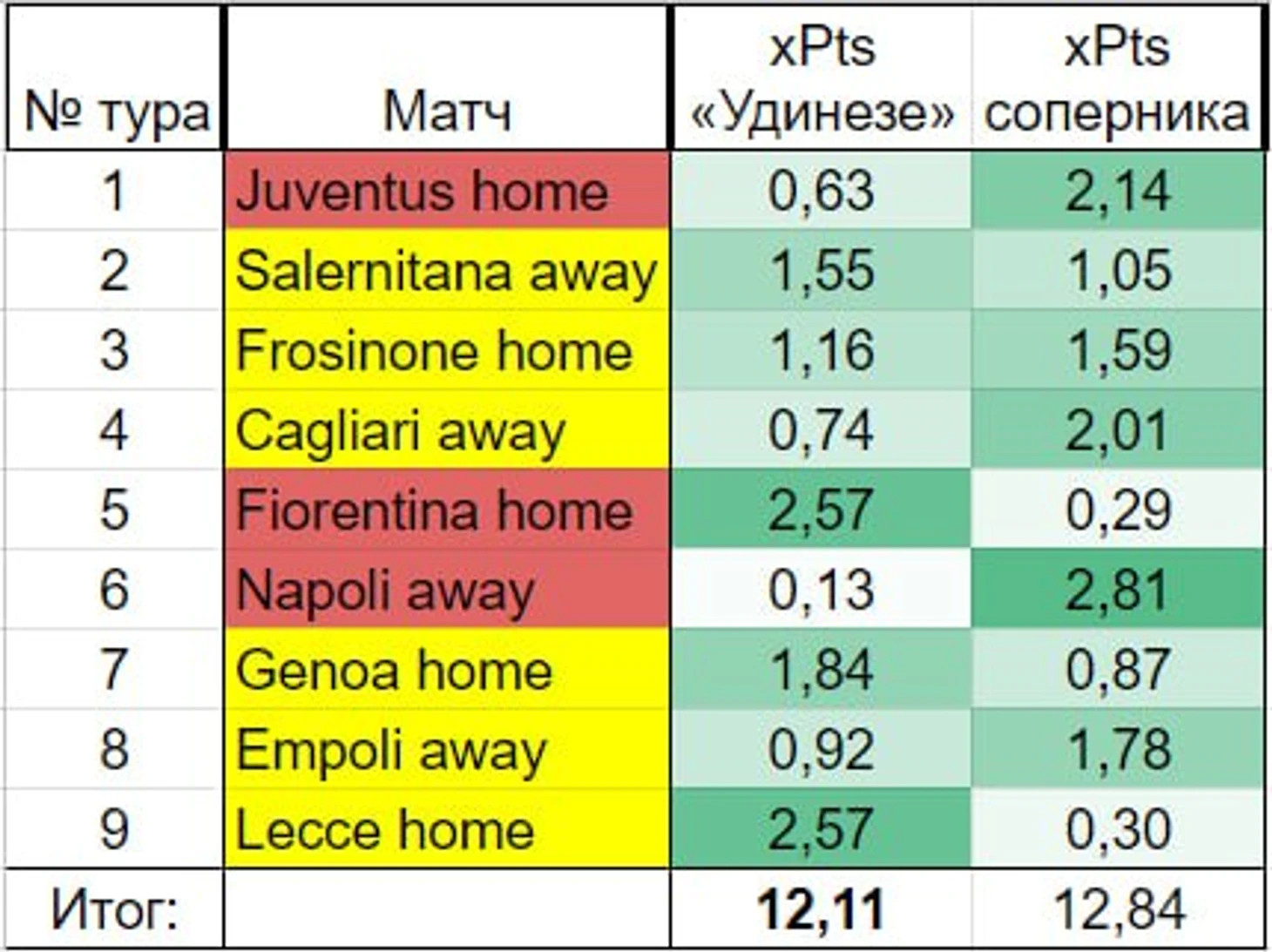 В реальности у «Удинезе» при Соттиле было шесть очков (шесть ничьих и три поражения). А должно было быть в два раза больше (12). По разнице xThreat (опасность собственных владений минус опасность владений соперника) на 90 минут «Удинезе» после восьми туров и вовсе шёл шестым.