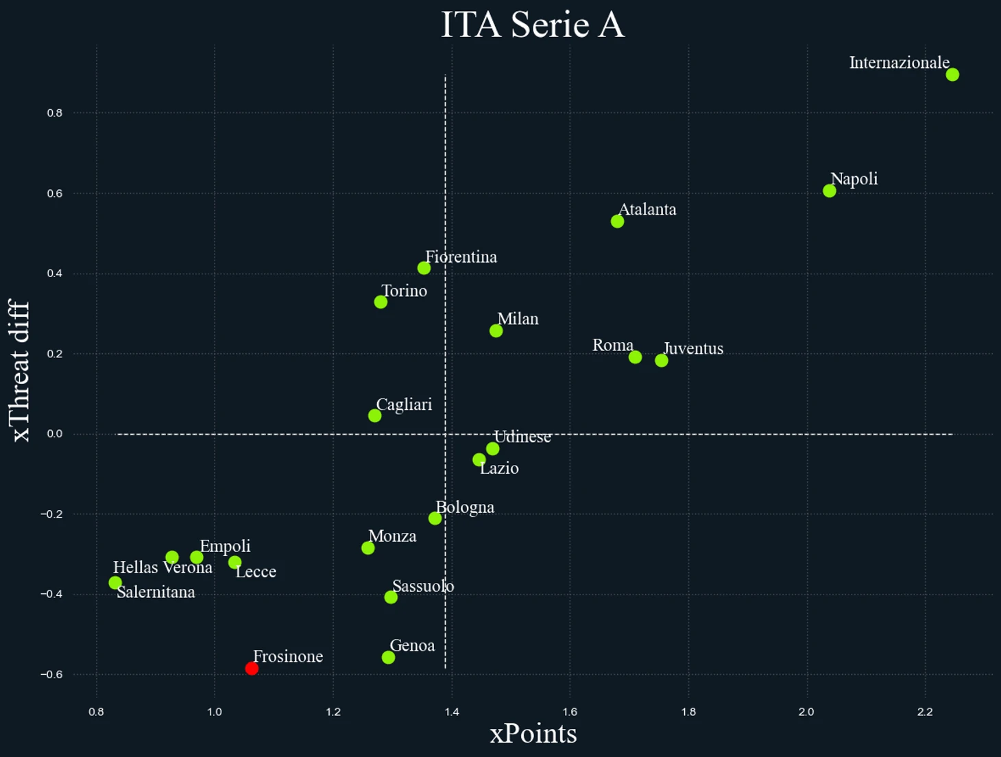 К сожалению, воплощение идей тренера со временем стало слишком наивным: «Фрозиноне» из главного открытия постепенно становится главной мишенью для всех, кто хочет или хотя бы может прессинговать. Лидерство по пропущенным мячам с игры (не совсем заслуженное, но что делать?), третье место по пропущенным со стандартов (хуже только «Лечче» с «Кальяри») и звание одной из худших команд по разнице xThreat. Всё ещё любим и надеемся на выживание, но Ди Франческо давно пора задуматься о балансировке рисков.