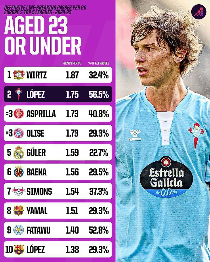 Лопес в прошлом сезоне был вторым после Вирца U23 игроком из топ-5 лиг по количеству разбивающих линии передач на 90 минут. При этом если смотреть на процентное соотношение таких передач ко всем отданным пасам, Лопес вообще был лучшим U23 игроком в топовых лигах: более половины (!!!) его передач разбивали линии соперника.