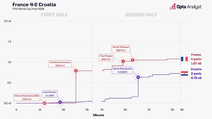 Дебютный гол сборной Франции стал еще одним первым: это был первый в истории автогол в финале чемпионата мира, когда Марио Манджукич со штрафного отправил мяч в свои ворота после удара Гризманна. Иван Перишич сравнял счет в матче за сборную Хорватии, но затем был признан виновным в подаче с углового.