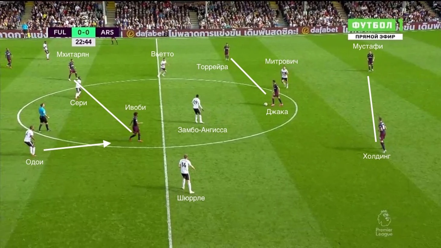 Мхитарян и Ивоби снова открываются под передачу. Но даже не получая пас, Ивоби выдергивает за собой центрального защитника "Фулхэма".